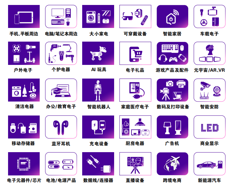 计算机(个人电脑/笔记本/PDA)、移动电话、平板电脑、儿童益智类(点读笔/学习板/手写笔)、可穿戴 设备、无人机、游戏机、数码相机、摄像机、投影仪、迷你扫描仪、记录器、移动存储器、电源、无线充电、 鼠标、键盘、路由器、电源适配器、散热器、自拍杆、支架、保护膜、保护壳等;